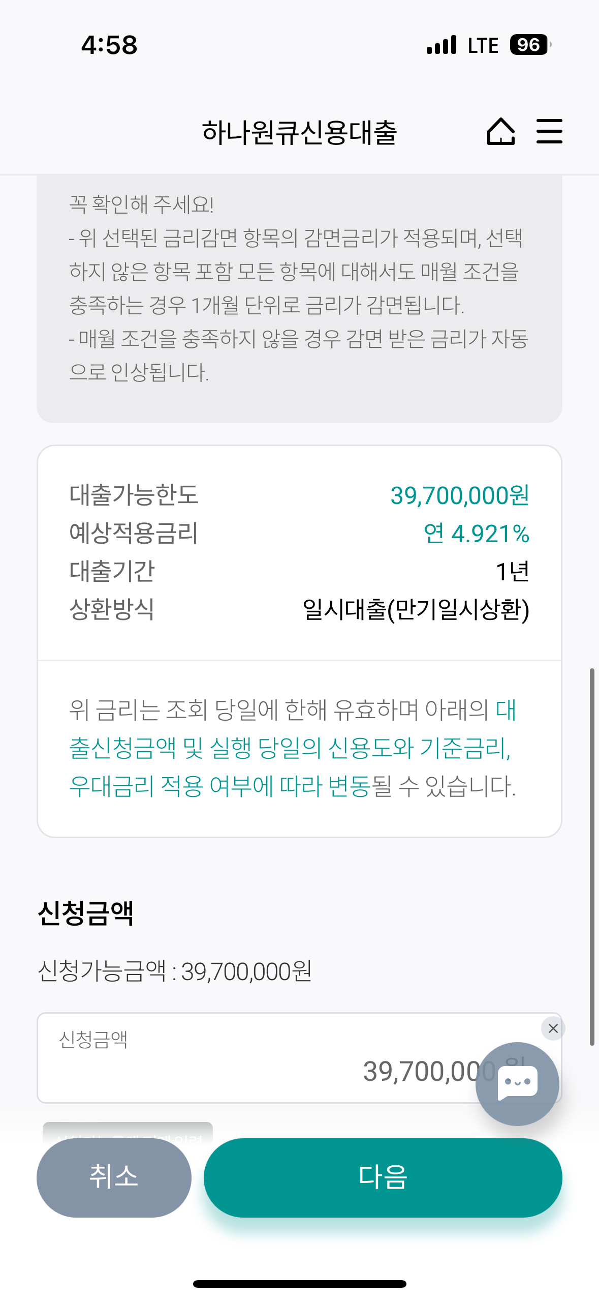 통장대출(마이너스통장)은 3,900만 원 - 금리 6.021% 대출한도가 조회되었습니다.