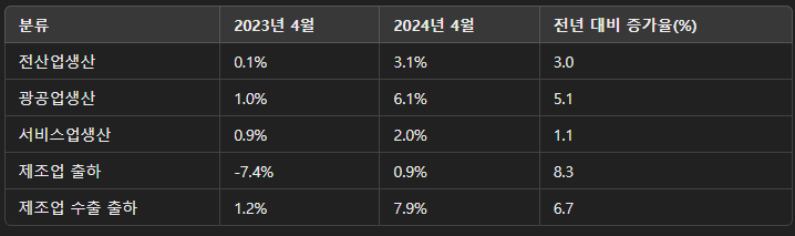 - 경기: 4월 전산업생산은 전월 대비 3.1% 증가했으며, 이는 대부분의 산업에서 부진이 완화되었기 때문입니다. 특히, 반도체와 자동차 산업의 생산이 증가세를 보여 경기 부진 완화에 긍정적인 영향을 미쳤습니다.