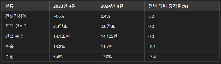 - 건설투자: 건설기성액은 미미한 증가에 그치고 있으며, 이는 건축 및 토목 부문 모두에서 증가세가 둔화되었기 때문입니다. 주택 인허가와 건설수주가 낮은 수준에 머무르며, 향후 건설투자의 둔화가 지속될 가능성이 큽니다.
