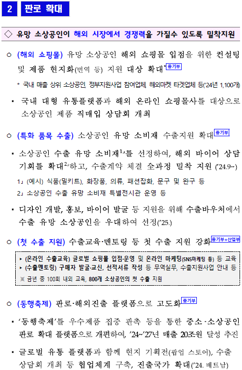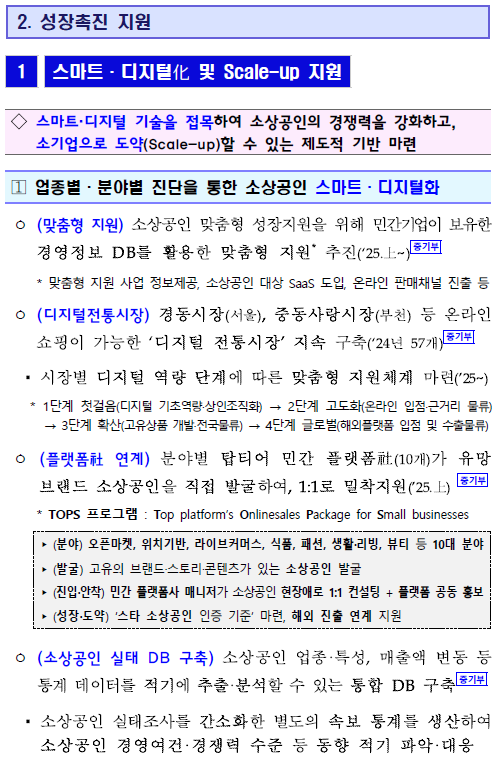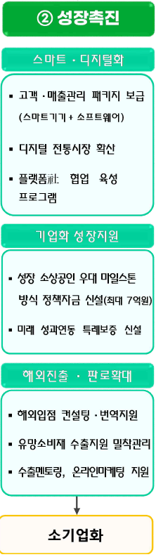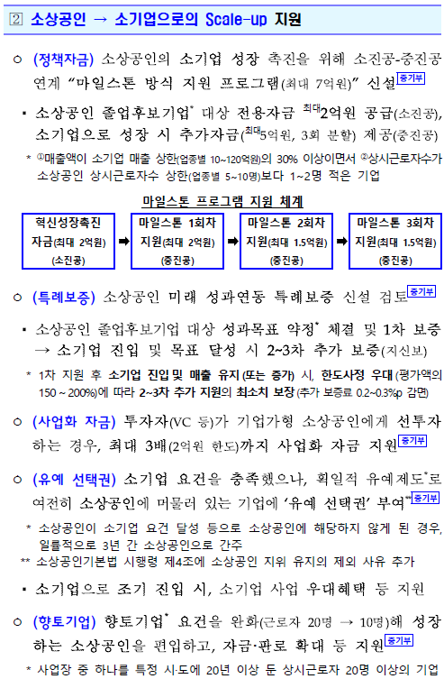 소상공인의 소기업으로 도약(Scale-up)도 집중 지원한다. 서비스형 소프트웨어 (SaaS) 보급 및 온라인 판매채널 진출 지원 등을 통해 소상공인의 스마트‧ 디지털화를 추진하고, 유망 소상공인이 소기업으로 성장시 소진공(최대 2억원)과 중진공(최대 5억원) 연계를 통해 최대 7억원의 정책자금을 지원하는 “마일스톤 지원 프로그램”을 신설한다. 소상공인이 해외 시장에서 경쟁력을 가질 수 있도록 해외 쇼핑몰 입점 등 판로확대도 밀착 지원할 계획이다.