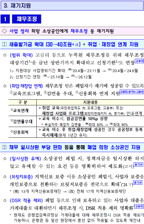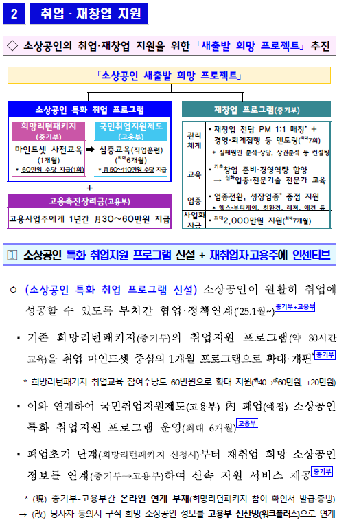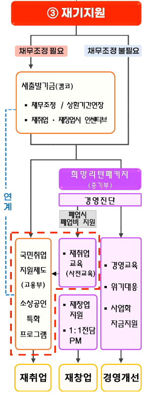 마지막으로, 경영상황이 크게 어려워진 소상공인에 대해서는 과감한 채무 조정과 함께 재취업‧재창업 등 재기를 적극 지원한다. 채무조정 대상을 늘리고 ‘새출발기금 규모’를 40조원 +α로 대폭 확대(기존 30조원)한다. 또한, 국민 취업지원제도, 희망리턴패키지 등과 연계하여 소상공인 취업‧재창업을 지원하는 「새출발 희망 프로젝트」를 추진한다. 특히, ‘소상공인 특화 취업지원 프로그램’을 운영하여 훈련참여수당(최대 6개월, 월 50~110만원)을 지급하고, 폐업 소상공인을 고용한 사업주에게는 고용촉진장려금을 1년간 월 30~60만원 (1명 당) 지급한다. 성장업종 중심으로 최대 2천만원까지 재창업 사업화를