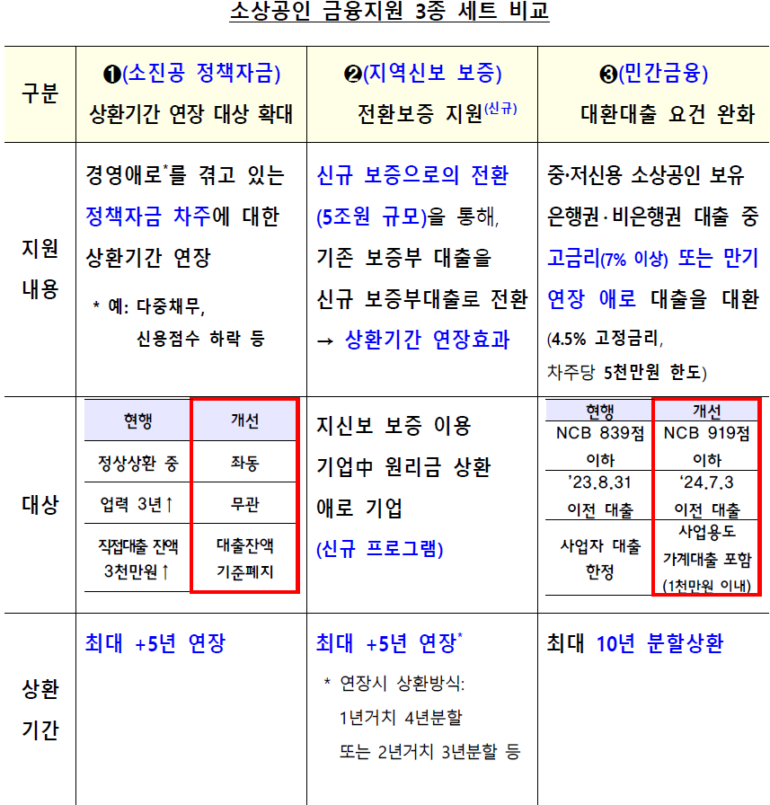 ‘24.8월부터 경영애로를 겪고 있는 소상공인의 정책자금 상환연장 대상을 대폭 확대하고, 연장기간도 최대 5년까지 확대한다. 지역신용보증 재단의 보증부 대출을 이용하는 소상공인이 상환기간을 최대 5년까지 연장 할 수 있도록 5조원 규모의 전환보증을 신설(‘24.7월)하고, 은행‧비은행권의 고금리 대출(7% 이상)을 소상공인시장진흥공단 저금리 대출(4.5% 고정금리, 10년 분할상환)로 전환하는 프로그램의 요건도 대폭 완화(‘24.8월)할 계획이다.