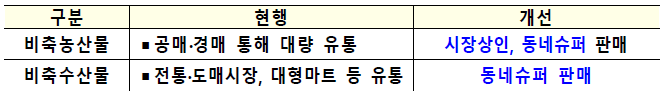 ㅇ (비축물자) 소매상인도 비축물자를 판매할 수 있도록 비축 농산물은 시장·슈퍼까지 , 수산물은 슈퍼까지 공급 해수부+농림부