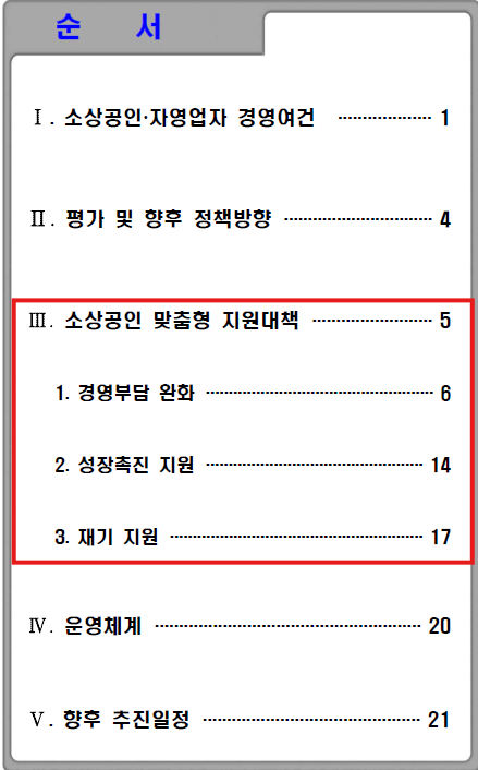 해장자료에서는 현재 소상공인 자영업자의 현황에 대해 파악하고 평가한 다음 정책방향을 설정한 후 지원대책에 대해서 좀 더 자세하게 소개해주고 있습니다. 제가 볼 부분은 지원대책부분만 보도록 하겠습니다.